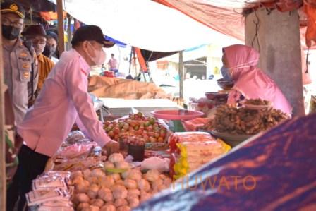 Masuk dari pintu utara atau arah hulude bunggu, orang nomor satu di pohuwato itu menelusuri semua jalur di pasar yang terbesar di wilayah barat gorontalo dan keluar pintu tengah atau jalur arah terminal. Tempat jualan rempah-rempah, beras, ikan, kain serta lainnya dikunjungi langsung untuk memastikan masyarakat yang menggunakan masker.