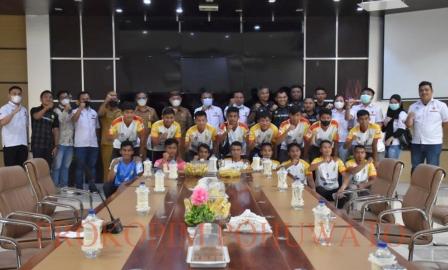 PROKOPIM.POHUWATO-Tim persatuan sepak bola pohuwato (PSP) yang akan mengikuti laga delapan besar liga Asprov Gorontalo dilepas Bupati Pohuwato, Saipul A. Mbuinga didampingi Ketua Asosiasi Kabupaten (Askab) Pohuwato, Nasir Giasi, Sekda Iskandar Datau serta sejumlah pimpinan OPD di ruang pola kantor bupati, Selasa, (28/12/2021).