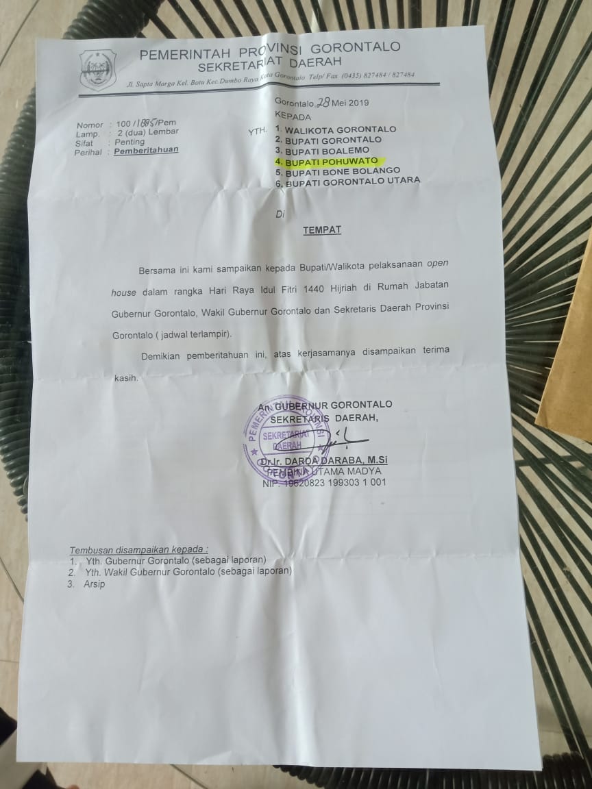 Untuk tertibnya pelaksanaan Open House Idul Fitri 1440 H tersebut sudah dibagi jadwal per-Kabupaten, dan jadwal Kabupaten Pohuwato sebagai berikut :