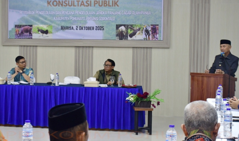 PROKOPIM.POHUWATO-Balai Konservasi Sumber Daya Alam (BKSDA) Sulawesi Utara menggelar Konsultasi Publik terkait revisi blok pengelolaan dan rencana pengelolaan jangka panjang kawasan konservasi Cagar Alam Panua. Kegiatan ini dibuka secara resmi oleh Bupati Pohuwato, Saipul A. Mbuinga, di Aula Marina Beach Resort (MBR), Maisa, Kamis (02/10/2025).
