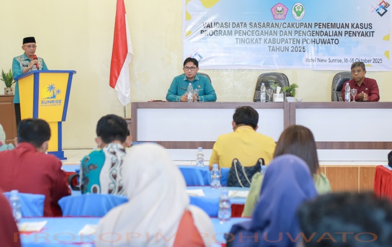 PROKOPIM.POHUWATO-Dinas Kesehatan Kabupaten Pohuwato menggelar kegiatan Validasi Data Sasaran dan Cakupan Penemuan Kasus Program Pencegahan dan Pengendalian Penyakit Tingkat Kabupaten Pohuwato Tahun 2025, yang berlangsung selama tiga hari, mulai 16 hingga 18 Oktober 2025 di Hotel Sun Rise Pohuwato dibuka Wakil Bupati Pohuwato, Iwan S. Adam, Kamis, (16/10/2025).
