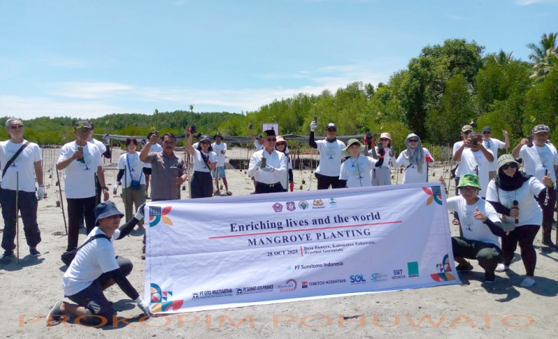 PROKOPIM.POHUWATO-Wakil Bupati Pohuwato, Iwan S. Adam, menghadiri kegiatan penanaman perdana mangrove yang digelar oleh PT Sumitomo Group bekerja sama dengan PT Panasonic Gobel, bertempat di Desa Bunuyo, Kecamatan Paguat, Senin (28/10/2025).