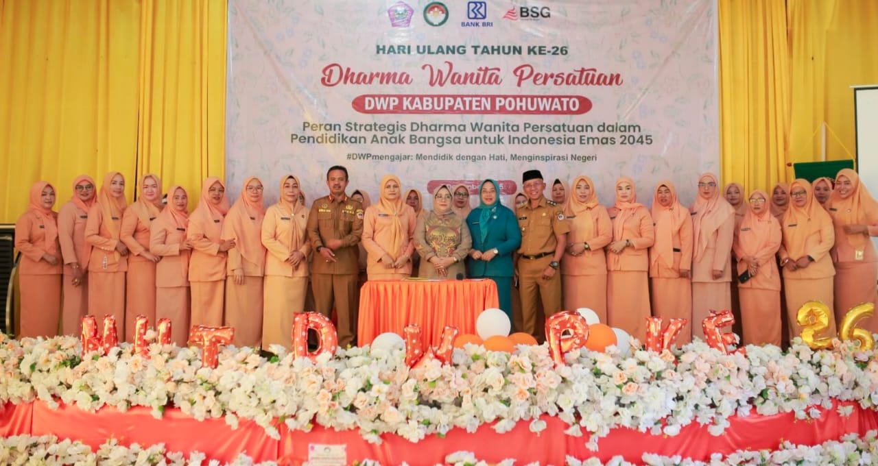 PROKOPIM.POHUWATO-Dharma Wanita Persatuan (DWP) Kabupaten Pohuwato menggelar Peringatan Hari Ulang Tahun (HUT) ke-26 di Gedung Panua, Senin (08/12/2025).