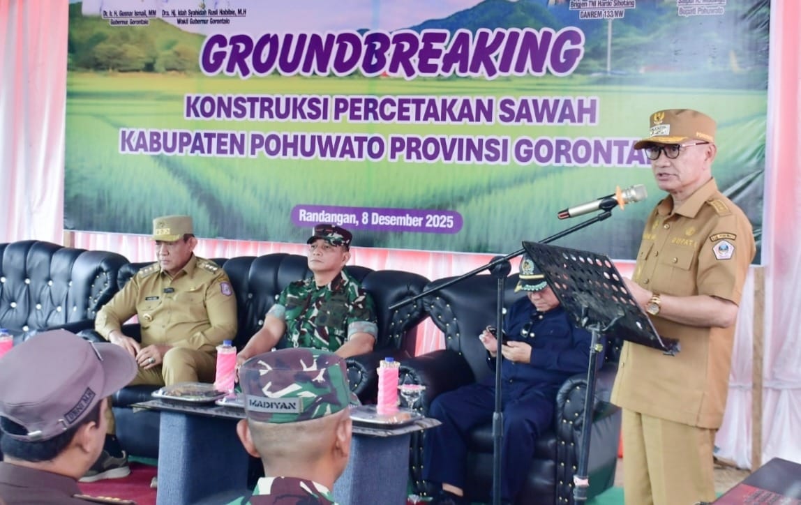 PROKOPIM.POHUWATO-Desa Manunggal Karya, Kecamatan Randangan, menjadi saksi dimulainya groundbreaking konstruksi percetakan sawah baru yang ditandai dengan pemecahan kendi oleh Gubernur Gorontalo, Gusnar Ismail, didampingi Bupati Pohuwato, Saipul A. Mbuinga, Senin (08/12/2025).