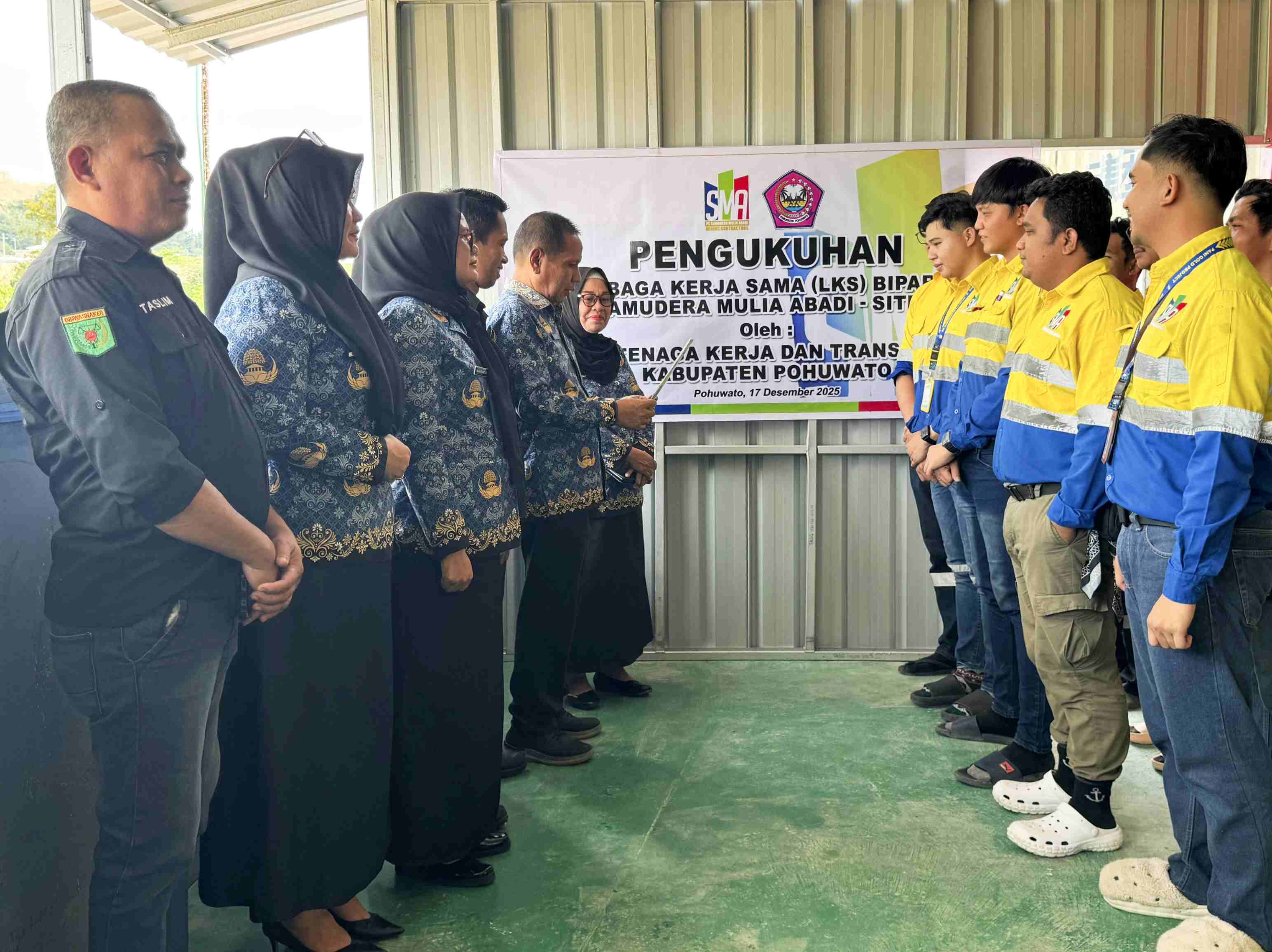 PROKOPIM.POHUWATO – Mewakili Bupati Pohuwato, Pelaksana Tugas (Plt) Kepala Dinas Tenaga Kerja dan Transmigrasi (Nakertrans) Kabupaten Pohuwato, Ir. Amrin Umar, secara resmi mengukuhkan Lembaga Kerja Sama (LKS) Bipartit PT Samudera Mulia Abadi (SMA).