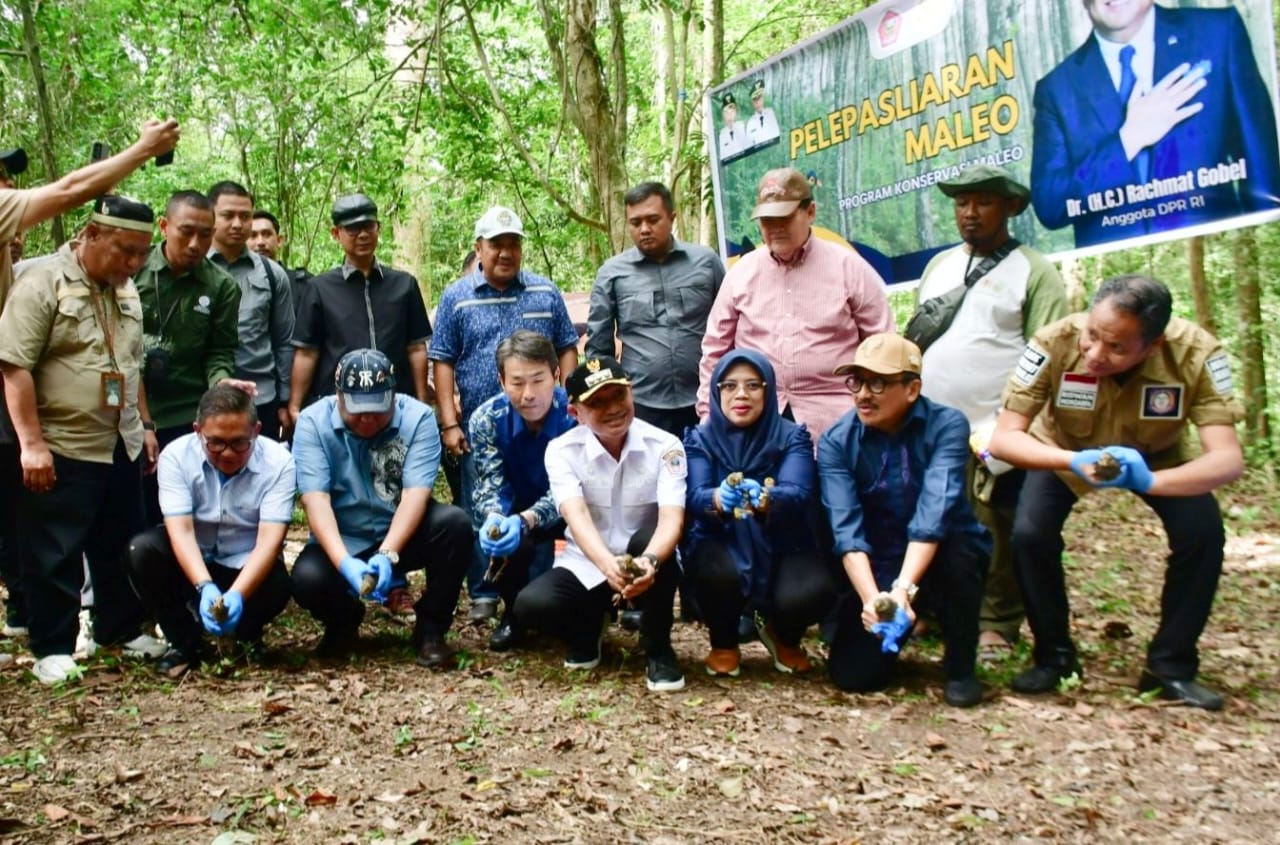 PROKOPIM.POHUWATO – Bupati Pohuwato, Saipul A. Mbuinga, bersama Wakil Bupati, Iwan S. Adam, mendampingi Anggota DPR RI Dapil Gorontalo, Rachmat Gobel, pada kegiatan pelepasliaran satwa Maleo di kawasan hutan cagar alam Desa Teratai, Kecamatan Marisa, Kamis (18/12/2025).