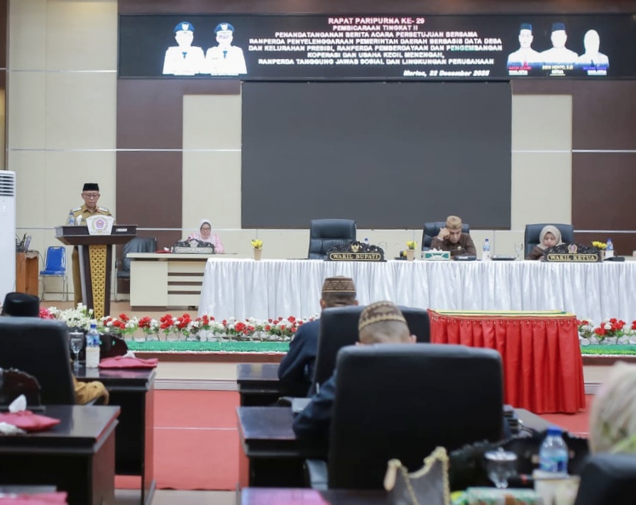 PROKOPIM.POHUWATO-Wakil Bupati Pohuwato, Iwan S. Adam, menghadiri Rapat Paripurna Dewan Perwakilan Rakyat Daerah (DPRD) Kabupaten Pohuwato dalam rangka pembicaraan tingkat II sekaligus penandatanganan berita acara persetujuan bersama terhadap tiga Rancangan Peraturan Daerah (Ranperda), Senin (22/12/2025).