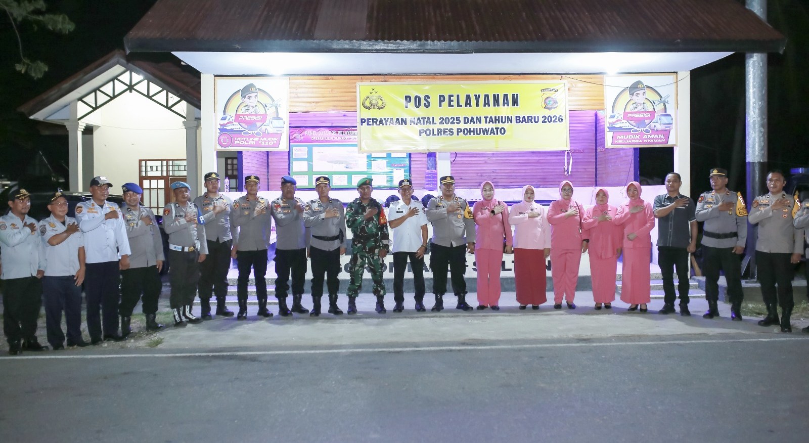 PROKOPIM.POHUWATO-Wakil Bupati Pohuwato, Iwan S. Adam, bersama Wakapolres Pohuwato, Kompol Heny Mudji Rahaju, Sekretaris Daerah, Iskandar Datau, didampingi Kasat Polisi PP, Nikson Pakaya, unsur Dinas Perhubungan, serta jajaran terkait, melaksanakan monitoring pengamanan malam Misa Natal di sejumlah gereja wilayah barat Kabupaten Pohuwato hingga Pos Pengamanan perbatasan Provinsi Gorontalo–Sulawesi Tengah, Rabu (24/12/2025).