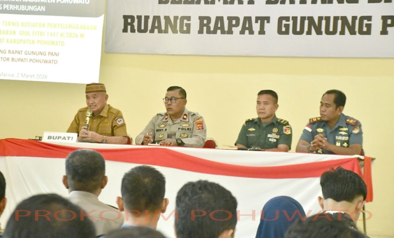 PROKOPIM.POHUWATO - Rapat Koordinasi Teknis Kesiapan Penyelenggaraan Angkutan Lebaran Idulfitri 1447 Hijriah/2026 Masehi tingkat Kabupaten Pohuwato resmi dibuka oleh Bupati Pohuwato, Saipul A. Mbuinga, didampingi Sekretaris Daerah Iskandar Datau dan Kepala Dinas Perhubungan Muslimin Nento, Senin (02/03/2026).